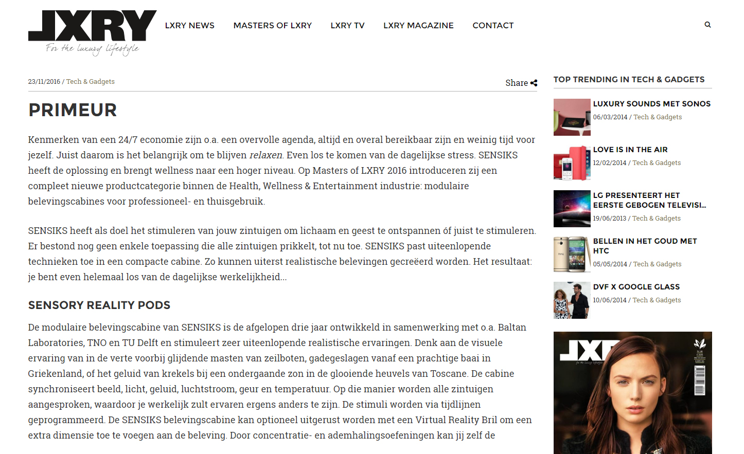 Kenmerken van een 24/7 economie zijn o.a. een overvolle agenda, altijd en overal bereikbaar zijn en weinig tijd voor jezelf. Juist daarom is het belangrijk om te blijven relaxen. Even los te komen van de dagelijkse stress. SENSIKS heeft de oplossing en brengt wellness naar een hoger niveau. Op Masters of LXRY 2016 introduceren zij een compleet nieuwe productcategorie binnen de Health, Wellness & Entertainment industrie: modulaire belevingscabines voor professioneel- en thuisgebruik.